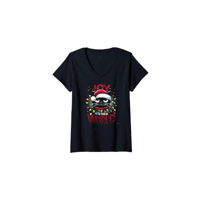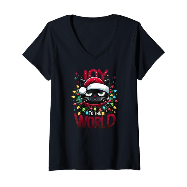 Womens Funny Christmas Black Cat Joy to The World V-Neck T-Shirt