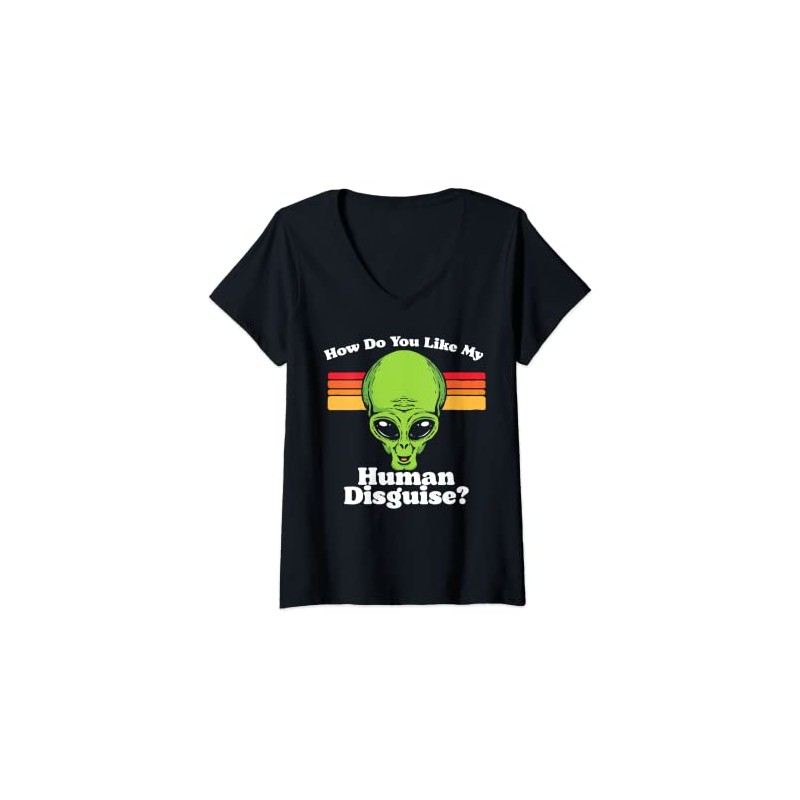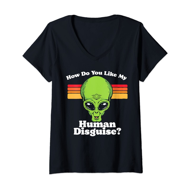 Womens How Do You Like My Human Disguise? Funny Cute Alien UFO 80s V-Neck T-Shirt