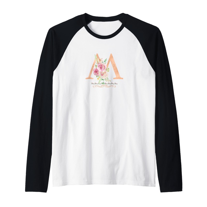 WOMENS LETTER 'M' INITIAL WATERCOLOR DUSTY PINK ROSE FLOWER Raglan Baseball Tee