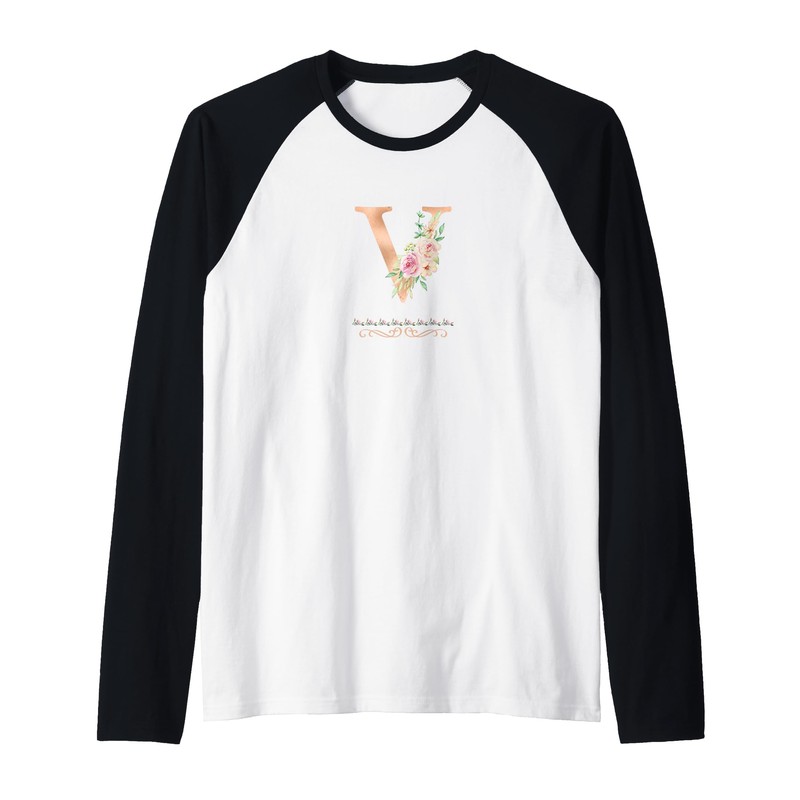 WOMENS LETTER 'V' INITIAL WATERCOLOR DUSTY PINK ROSE FLOWER Raglan Baseball Tee