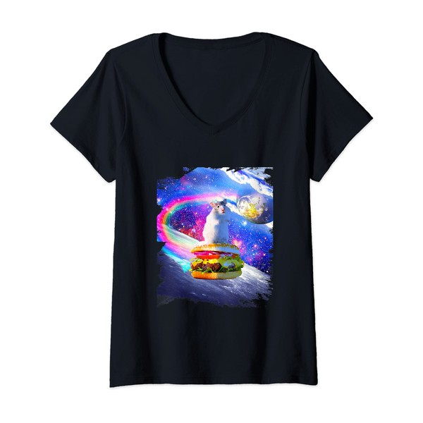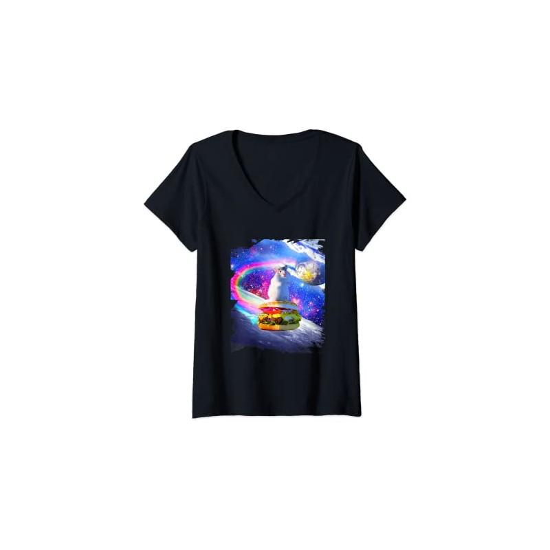 Womens Rainbow Space Hamster Riding Burger V-Neck T-Shirt