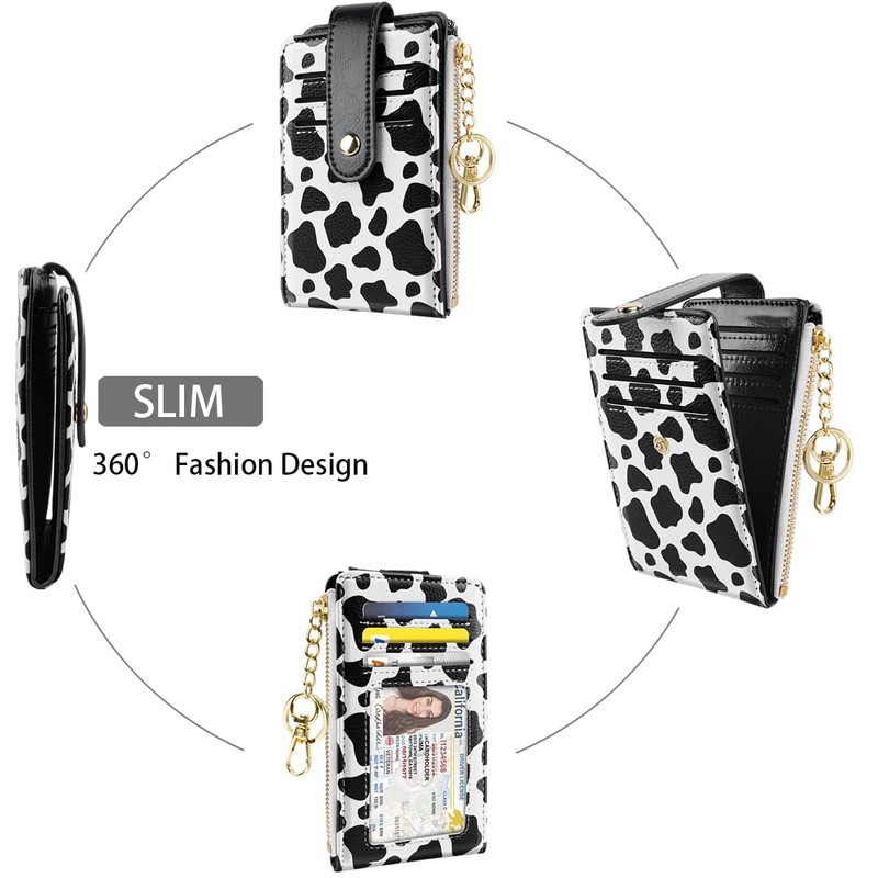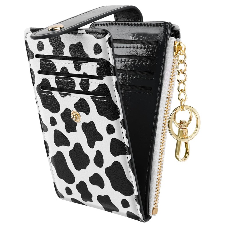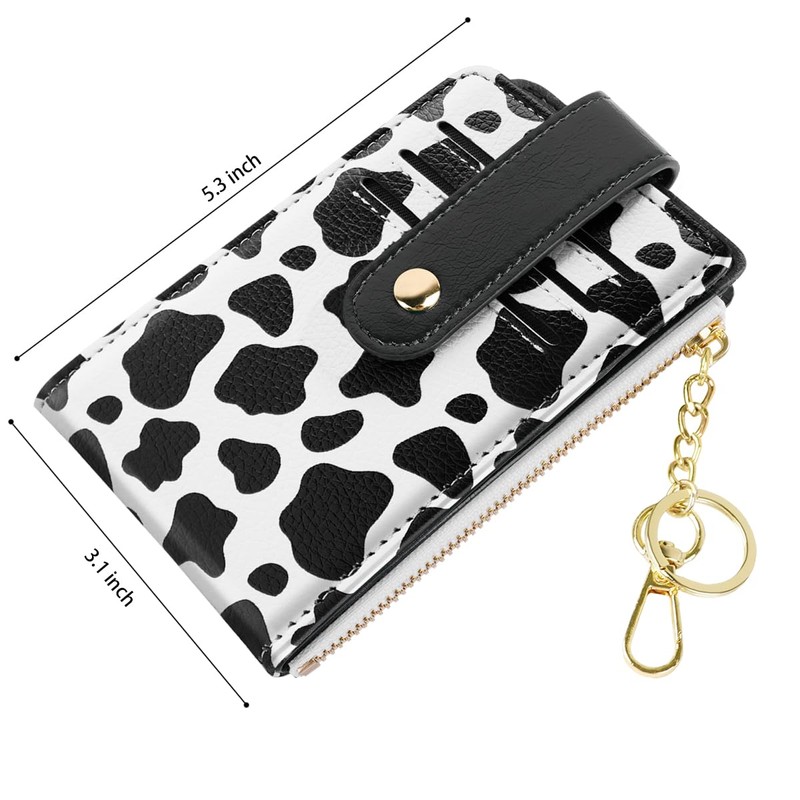 - Bifold Wallet: This small women wallet is made of cute cow pattern on litchi leather and matched with the homeochromatic system premium oil leather. Each card slot has made of neat double-stitched sewing thread, which is durable, no need to worry about the card slots ripped open. Sturdy and smooth keychain zipper are easy to put on and off.