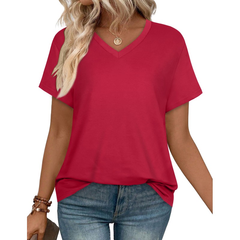 Womens T Shirts V Neck Short Sleeve Summer Tops Casual Basic Tees, Solid Red, 3XL