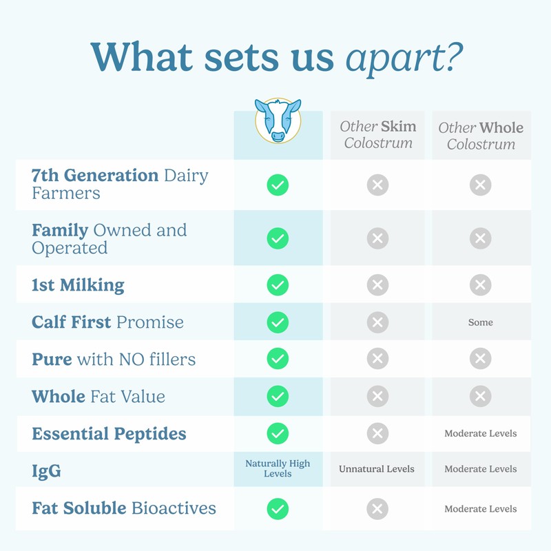 - The WonderCow Promise: We source our bovine colostrum from sustainable, reputable farms that use ethical and humane farming practices. Our product contains no artificial ingredients, sweeteners, dyes, additives, or fillers - just pure, high-quality colostrum powder. Additionally, we follow our Calf-First Promise, ensuring that the newborn calves receive the colostrum they need before we collect any excess. This means that our colostrum is not only effective, but also sustainable and ethical.