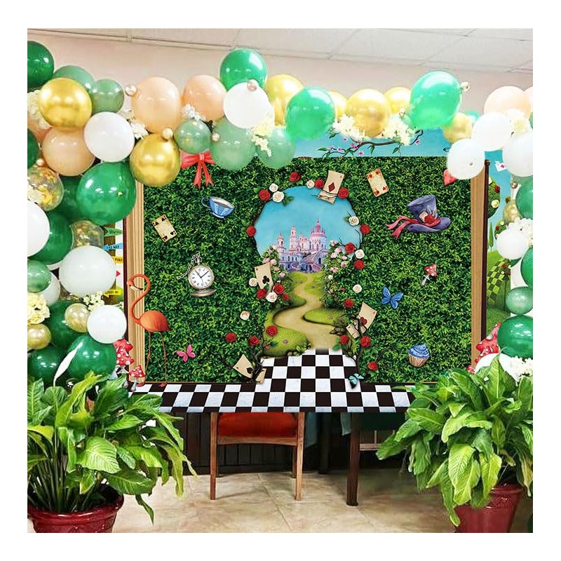 Wonderland Decoration Backdrop for Photograpy Fairy Tale Castle Tea Party Green Leaves Background 7×5ft Wonderland 1st Birthday Photo Backdrop Banner