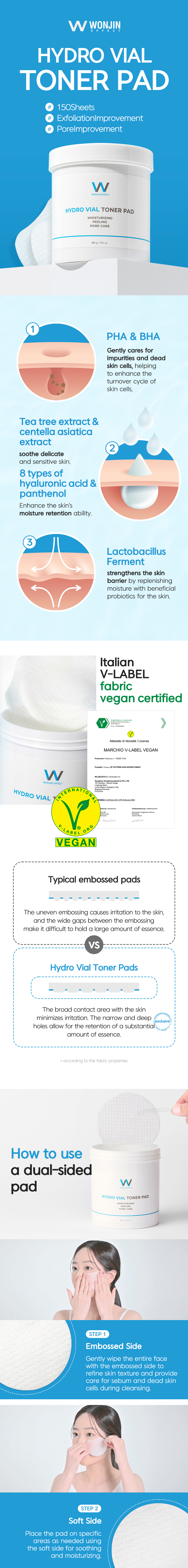 When using the anti-pore pad for 2 weeks, it improves outer skin elasticity around pores, reduces pore area, and improves dead skin cells and skin texture. The hydro vial toner pad fills in pores and removes dead skin cells. 100% satisfaction in dead skin cell control, improved pore elasticity, reduced pore area, smooth skin texture, and 2-week usage. The clinical trial results showed that this product improves outer skin elasticity around pores, reduces pore area, and improves dead skin cells and skin texture. This special embossing vegan pad is recognized by V-label in Italy. The product touches skin with wide area, and the narrow and deep holes can hold a large amount of essence. Completed tests regarding low irritation, dermal, and non-detection of heavy metals. The embossed side clears skin texture and removes dead skin cells. The soft side provides moisture and improves pores.
