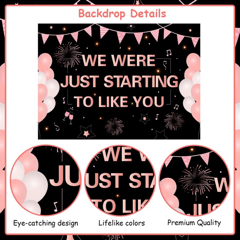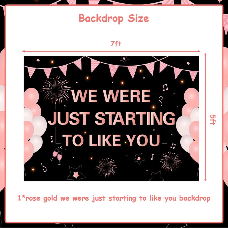 - We were just starting to like you backdrop: Measuring 5 feet by 3 feet, this vibrant black and gold banner features a festive design with stars, balloons, and fireworks, perfect for commemorating retirements, goodbyes, or new beginnings. The bold text stands out against the dark background, adding a touch of humor and sentimentality