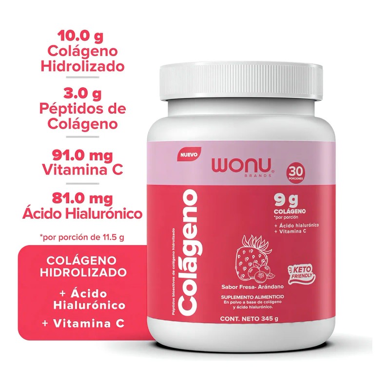 Wonu Colágeno Hidrolizado Polvo Con Ácido Hialurónico 345g Sabor FRESA ARANDANO