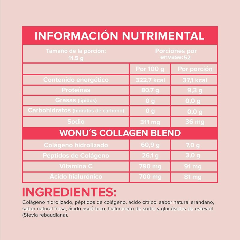 WONU I Colágeno Hidrolizado I 600g I 52 Servicios I Sabor Fresa-Arándano I Con Ácido Hiluronico Y Vitamina I Sin Azúcar