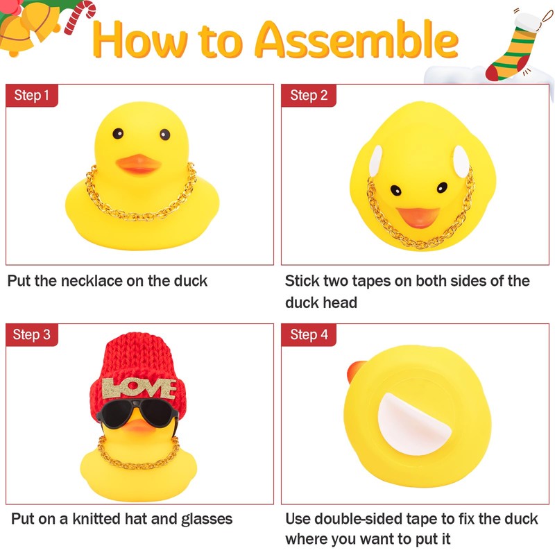 - Need to Assemble: DIY Duck! Put on the necklace and fix the hat and glasses with mini tape, fix the duck bottom with double-sided tape wherever you want