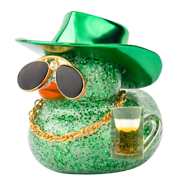 wonuu Car Decorations Beer Rubber Ducks, Dashboard Rubber Ducky for Car Ornament Cute Duck with Laser Cowboy Hat, Glasses, Necklace, Green