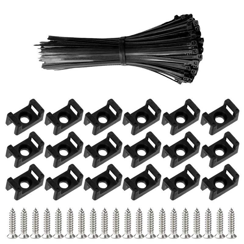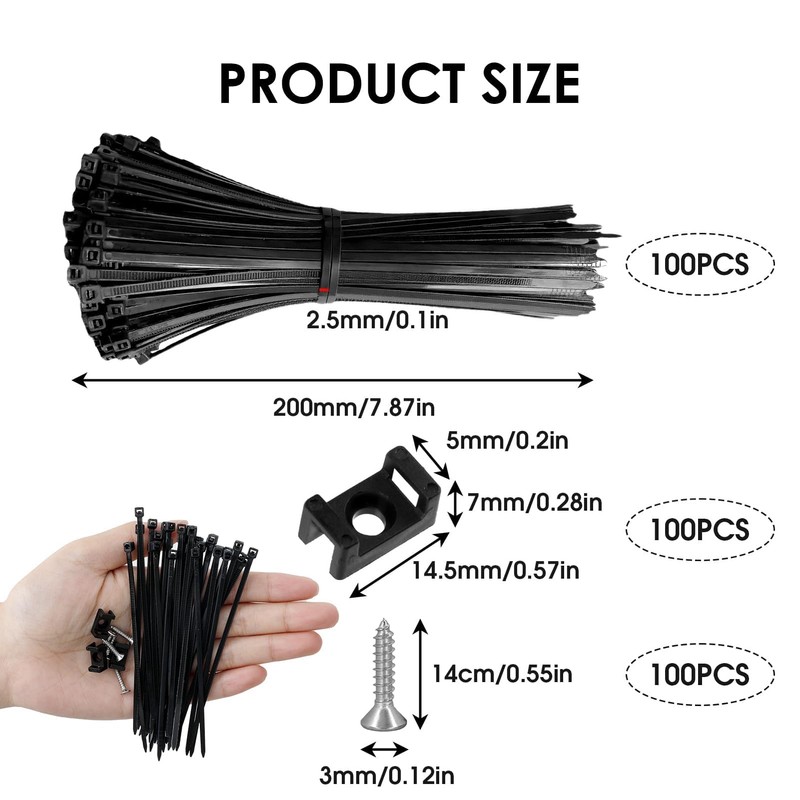 - Package includes: 100 pieces 2.5 x 200 mm cable ties black, 100 pieces 15 x 10 x 7 mm cable clamp bases, as well as 100 pieces Phillips screws. The sufficient quantity and moderate size can be of considerable help to you and are suitable for grouping different items.