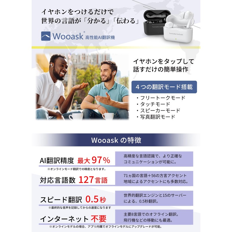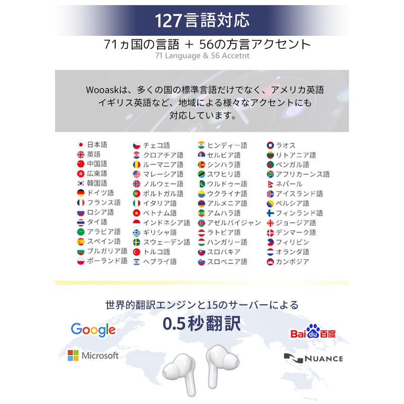 - Translation and Translation Accuracy: Supports translation of 127 languages around the world + 56 dialed accents. Wooask translation accuracy is 97% (Online translation is accurate). It has a very high perception of all languages, including Japanese, English, and more, allowing for more accurate communication