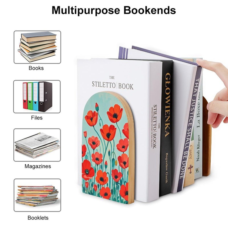 Wood Bookends Decorative Bookshelf Poppy Flowers Print Heavy Duty Wooden Book Shelf Decorate Bookshelves Book Stopper Book Holders Desk Accessories