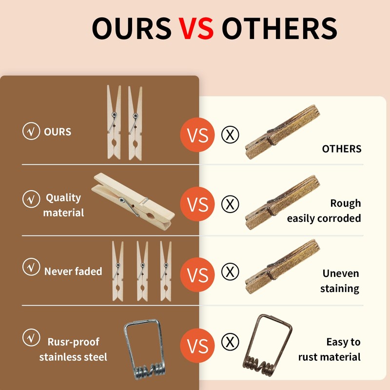 - High quality materials: Heavy duty clothespins are made of 100 percent birchwood and strong stainless steel springs, less likely to break or snap, keep your clothes securely fastened to the hanger.