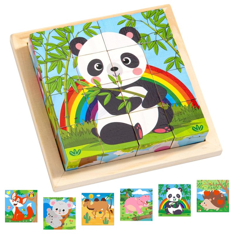 - 6-in-1 wooden cube puzzle: wooden toy is an easy to play 6-in-1 puzzle. 16 cubes can make the 6 cheerful animal motifs - panda, koala, hippo, fox, hedgehog and camel. As well as a durable wooden palette to store all puzzles for easy storage.