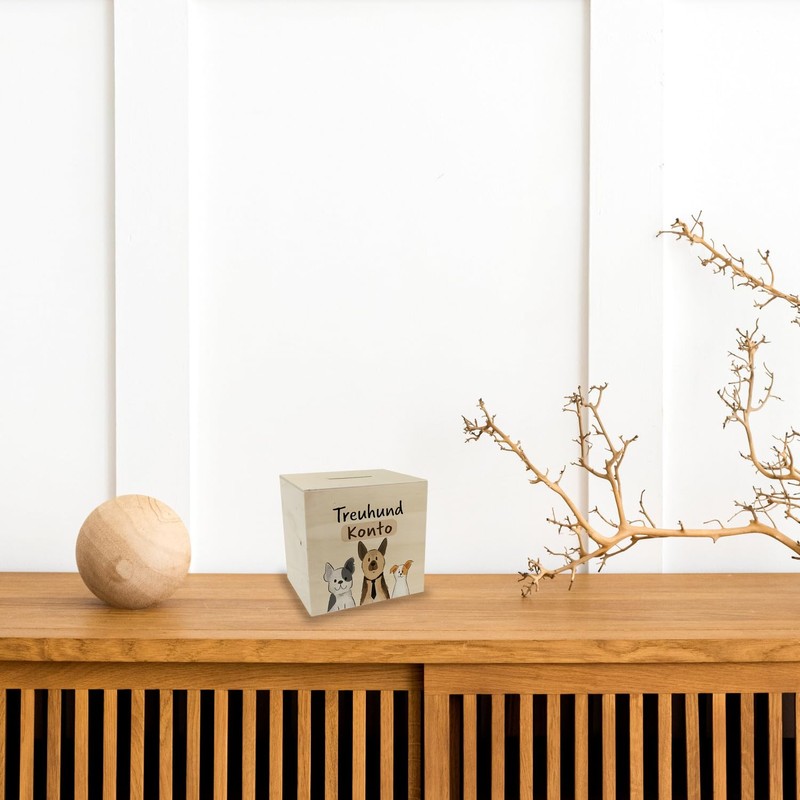 - Box contents: 1 x dog money box made of wood with saying "Treuhundkonto"