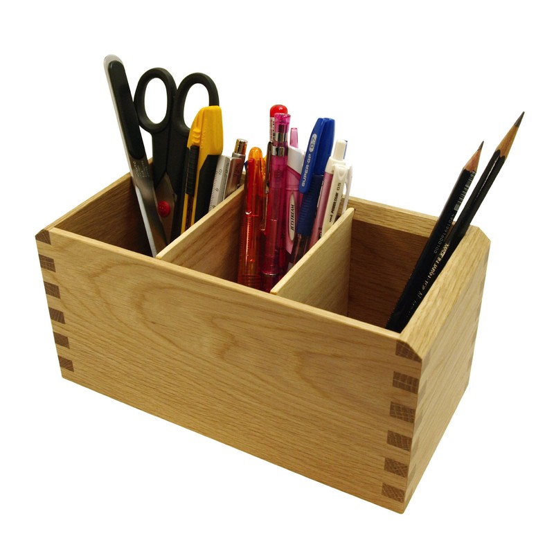 Outer Size: W 8.7 x D 4.3 x D 4.3 inches (220 x 110 x 108 mm). Inner size (1 square): Width 2.5 x Depth 3.4 x Depth 3.7 inches (64 x 85 x 95 mm). Inner Dimensions (Overall): 7.7 x 3.4 x 3.7 inches (195 x 85 x 95 mm). This pen stand is made of solid Nala wood. The joints are "unassembled" with no nails or screws to make them very durable. In addition, the cork on the bottom is designed to prevent damage to the contents of your items and is practical. The inner divider can be removed, so you can store a wide range of stationery such as scissors and rulers.