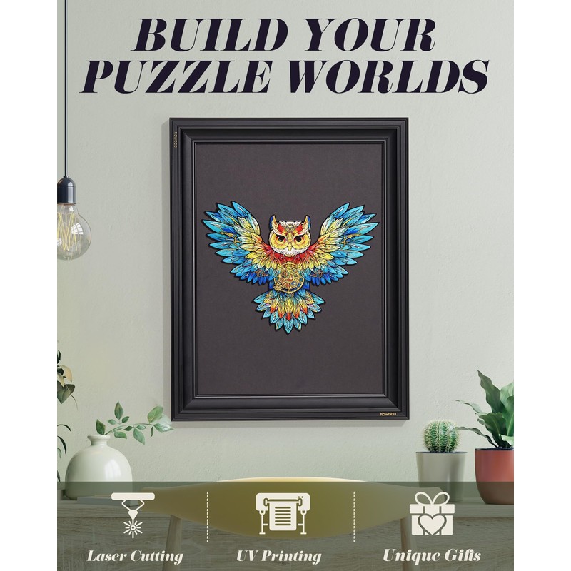 - 【Owl Design】Expertly laser-cut into 200pcs of unique shape pieces , this Wooden Puzzle immortalizes the owl’s penetrating gaze through UV printing, casting an ethereal phosphorescent glow that transforms night spaces into enchanted forests.