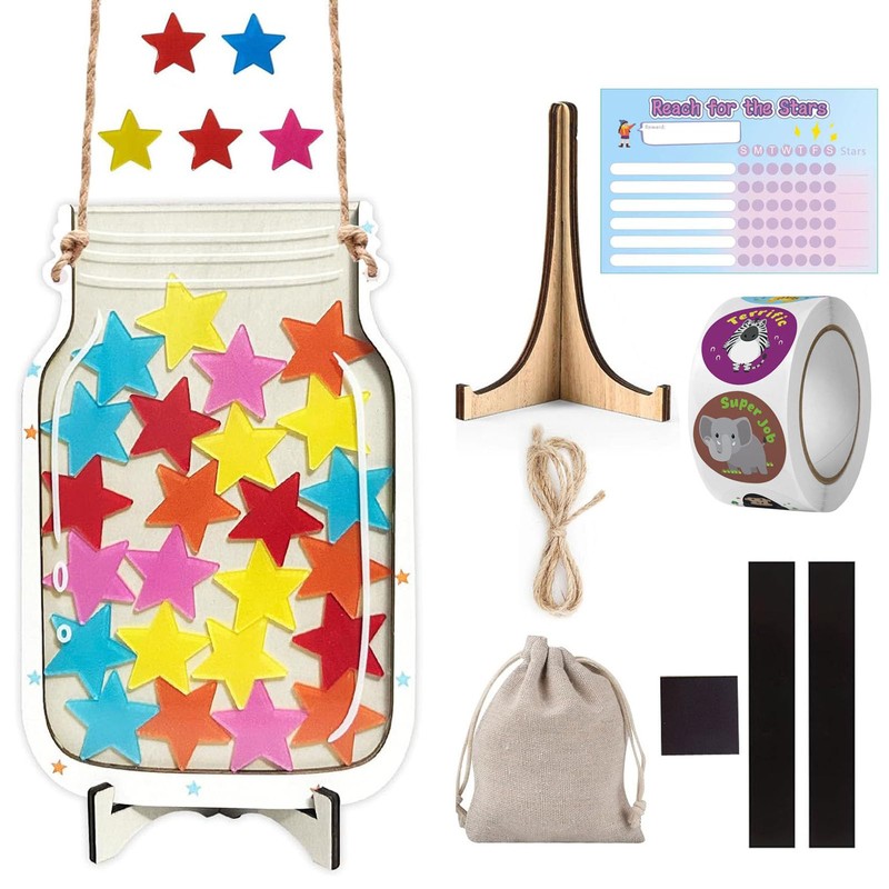 - 【Wooden Reward Jar System】This reward jar set includes everything you need, package includes 1 x reward jar, 25 x colorful starts, 1 x storage bag, 1 x jar stand, 1 x Rope, 3 x strips, 1 x chore chart, 1 Roll Animals Praise Incentive Decal(500 Pieces)