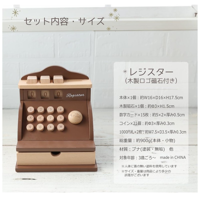 - Wooden money x 23 pieces (21 coins, 2 1000 yen bills): Coin approx. diameter 1.2 x thickness 0.1 inches (3 x 0.3 cm), 1000 yen bills, approx. W 3.5 x D 0.3 cm
