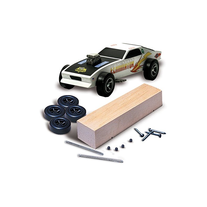 Kit includes wood block, wheels and four lead-free nail-type axles. Wheels and axles should be the same on all cars in a race. Block measures approximately 1 3/4 in w x 7 in l (4.44 cm x 17.7 cm)