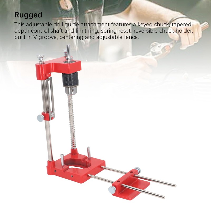 - Rugged: This adjustable drill attachment features a keyed chuck, tapered depth control shaft and limit ring, spring reset, reversible chuck holder, built in V , centering and adjustable fence.