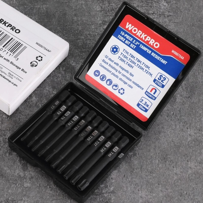 WORKPRO 10pcs Security Torx Bit Set, CNC Machined S2 Steel Star Bit Set, 2.3" Long Tamper Proof Torx Screwdriver bit with Magnetic Tips, Tamper Resistant Fastener Drive Bits with Storage Box