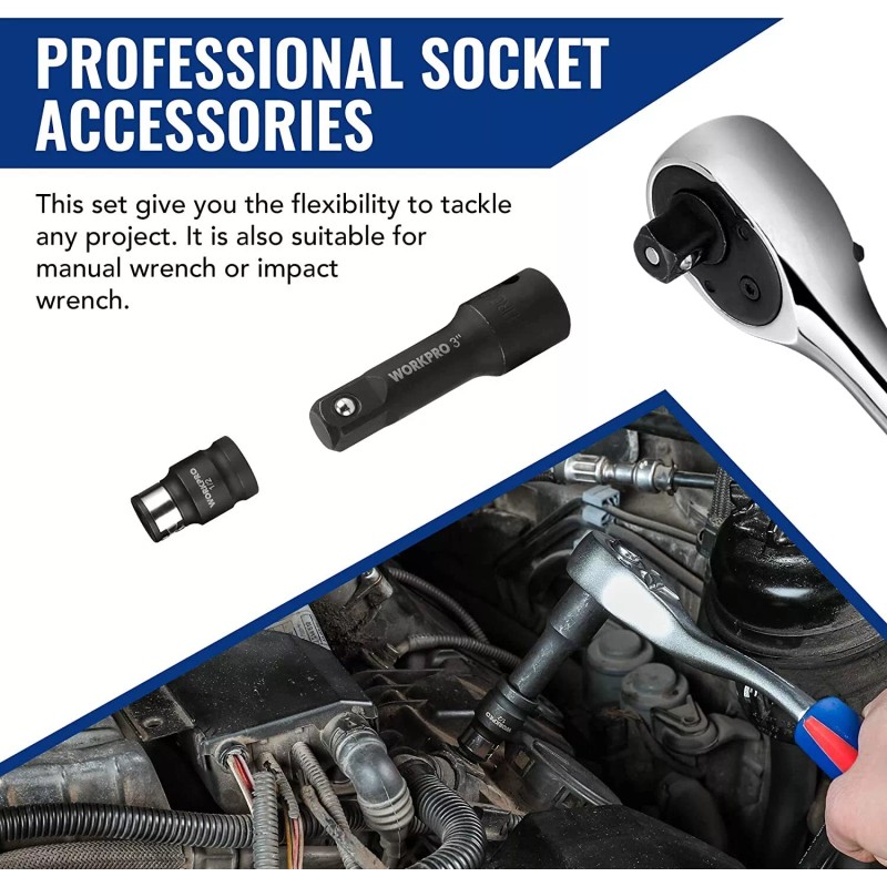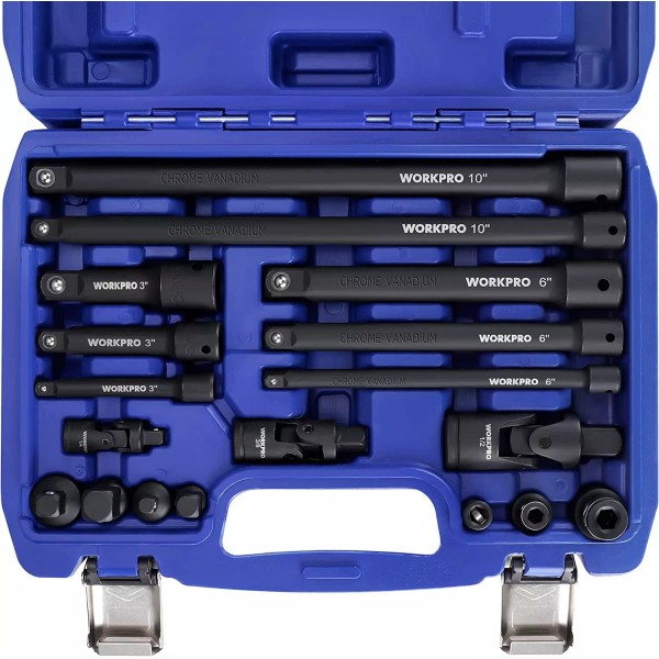 WORKPRO 18-Piece Impact Socket Extension Set, Includes Socket Adapters, Ratchet Extension Set, Socket Extension Bar, Swivel Universal Joints and Impact Coupler, 1/4", 3/8" & 1/2" Drive