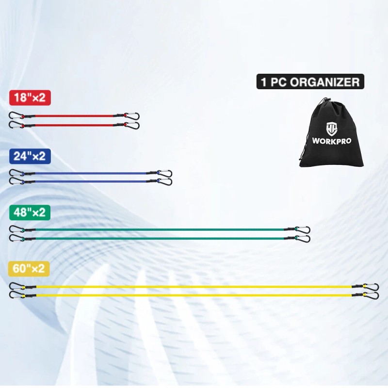 WORKPRO 8PCS Bungee Cords Heavy Duty Outdoor 18", 24", 48", 60" in a Storage Bag
