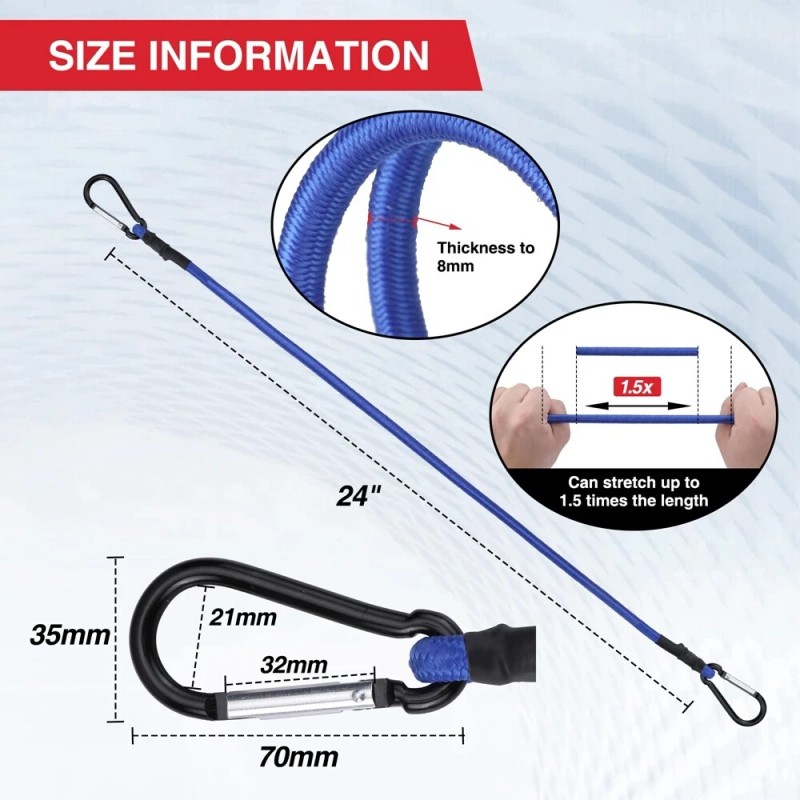 - đăWide Applicationsă8-pack bungee cords in 4 lengths, 18" 24" 48" 60". It has an advantage in both length and width over ordinary bungee cords. It has a stronger carrying capacity and can meet your higher requirements. These heavy-duty bungee cords are highly elastic and supportive and are compatible with bags of all sizes and weights. Compatible with all bikes, cars, carts, luggage racks, camping, gardening, clotheslines
