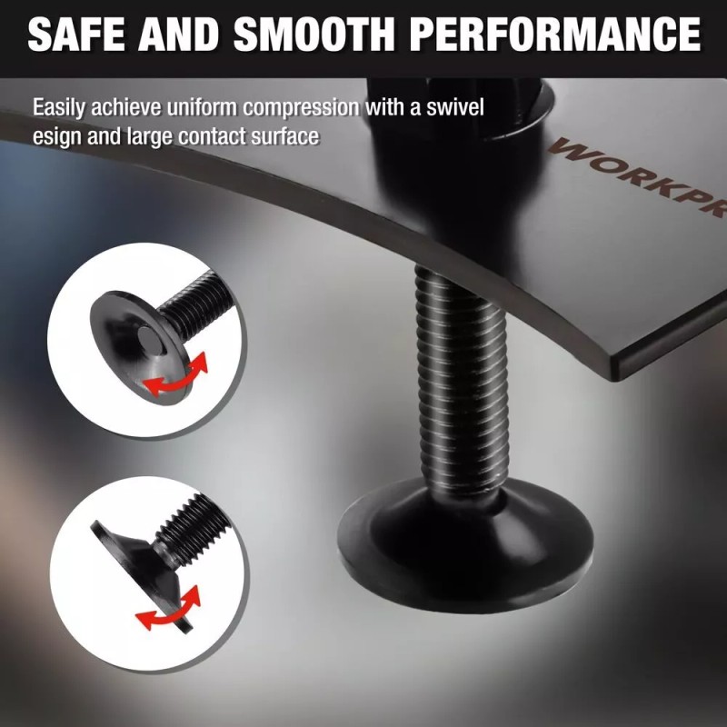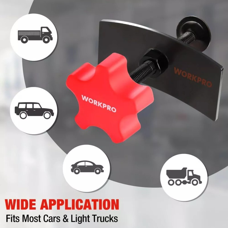 WORKPRO Brake Pad SpreaderThis brake caliper tool is forged from carbon steel, which is very strong, wear-resistant. The threads on the screw are regular and complete, making the operation smooth and the compression quick |