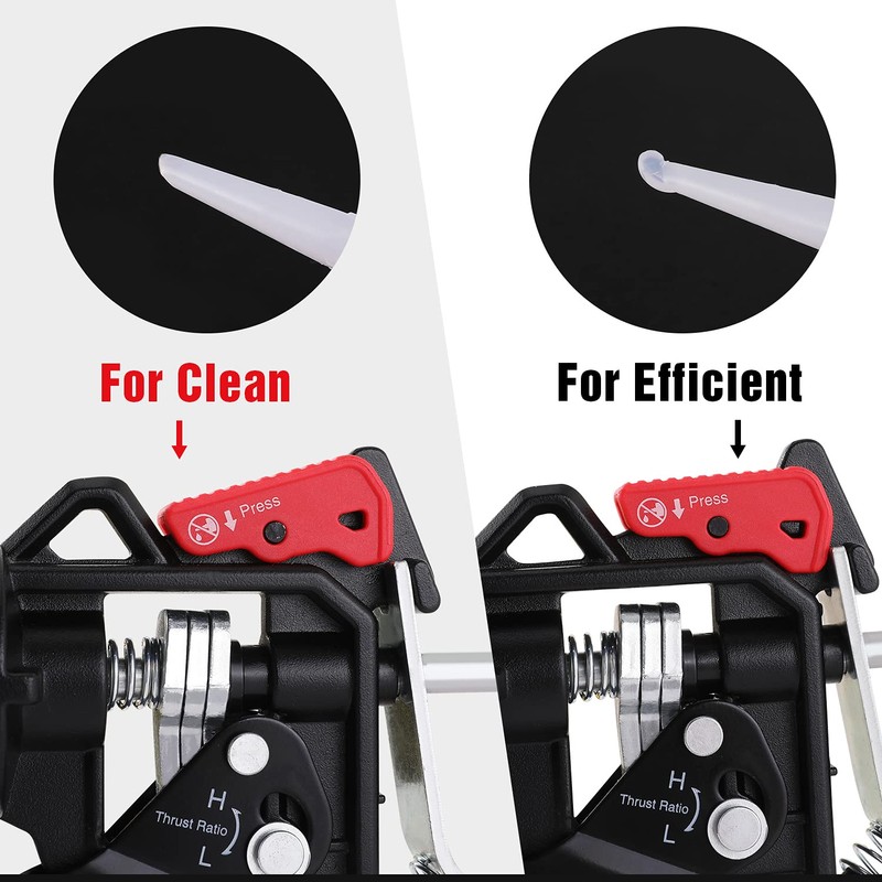 - Drip Controllable: The hand caulk gun can switch from drip to no-drip for dispensing desired applications. Press down on the front of the red button, this process stops the caulk from flowing and allows for clean, smooth transitions and less mess to clean up. Press down towards the rear of the red button, this mode keeps constant pressure on the tube for providing smoother action and quicker working.