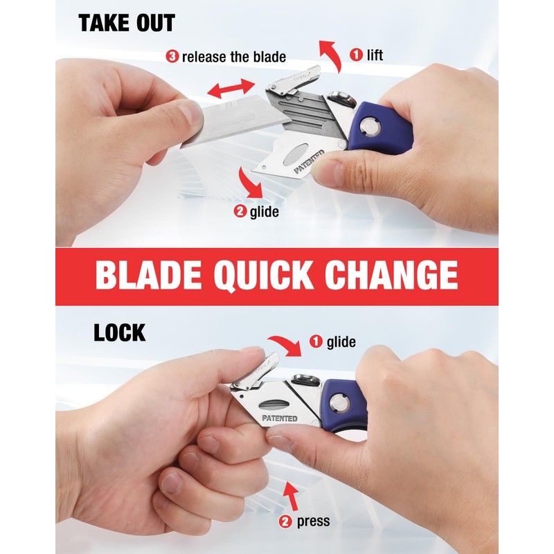- Quick-change mechanism. Your brand new work knife comes with an easy blade release mechanism that allows you to safely change the blades and helps prevent injury. Just push the head-cover of the blade and drop-down the cover of the blade. Our knife is compatible with most standard sized utility blades for extra convenience