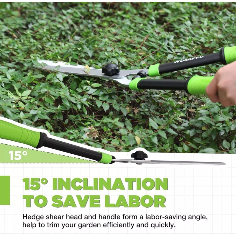 Labor-saving design: The 23" Hedge Shears feature a plier head tilted at 15°, reducing the bending distance required when cutting low shrubs. This ergonomic design minimizes strain on the user's back and arms, allowing for comfortable and efficient trimming of low-lying vegetation.