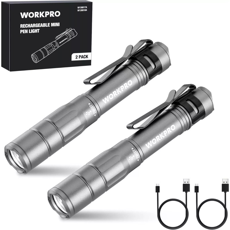 WORKPRO Rechargeable Pen Light Mini Flashlight 2 Pk Ultra-Compact EDC Flashlight - Gray