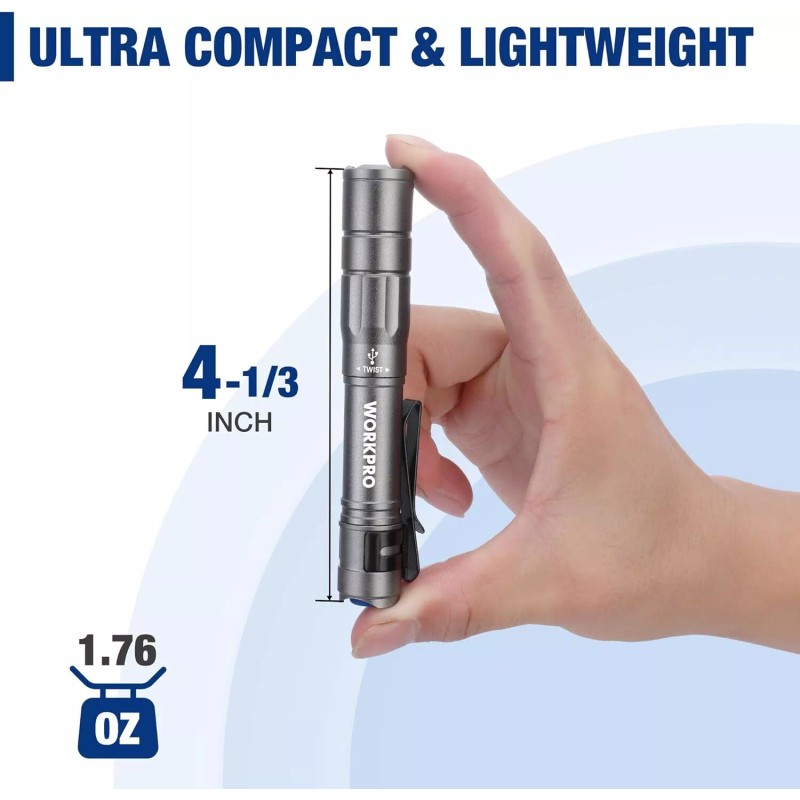 Small Yet Mighty - The WORKPRO Mini flashlight features the highly recommended T8 Osram LED, which deliver an incredible 300 lumens and a beam distance of up to 196 feet. With its ultra compact design, measuring just 4-1/3inch in length and weighing only 1.76oz, the small flashlight takes up barely any space in the pocket.