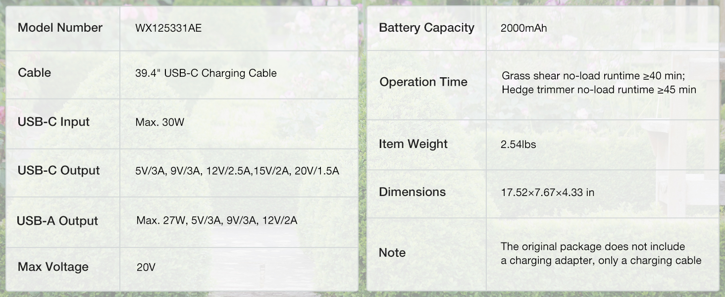👍Powerful Performance: The 2.0Ah battery delivers impressive power to the WORKPROX 20V cordless hedge trimmer, providing up to 40 minutes of grass cutting or 45 minutes of hedge trimming on a single charge. This battery also powers various WORKPROX 20V power tools and can double as a portable power bank. With an integrated display, simply press a button to check the battery level. (Tip: For ultra-fast charging, we recommend using a 30W charger for a super quick 1.5-hour recharge.)