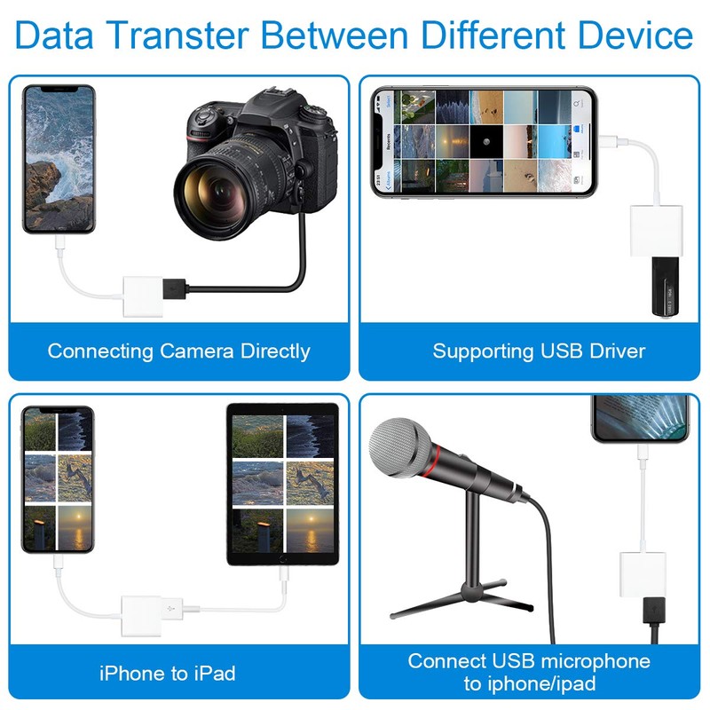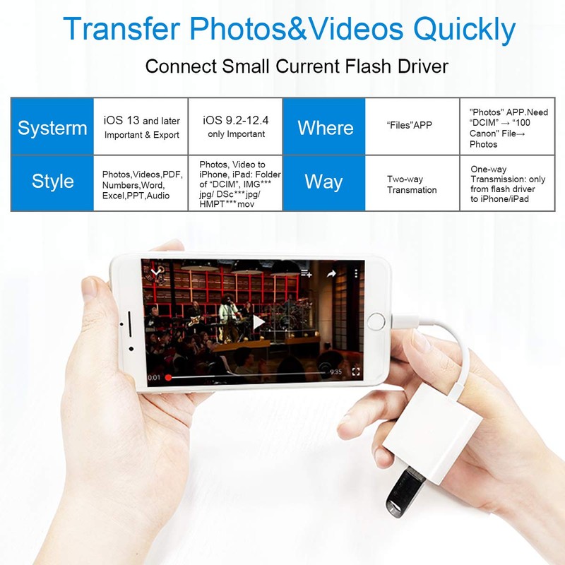 - HOW TO USE: Connect the Lightning USB3 Camera Adapter to iPhone/iPad, open the Photos app, which let you choose photos and videos to import, then organizes them into albums. for iOS13+, is the two-way transmite. You can transsfer picture,video,MP3 files,MP4 files,Excel,Word,PPT,PDF on Files App.