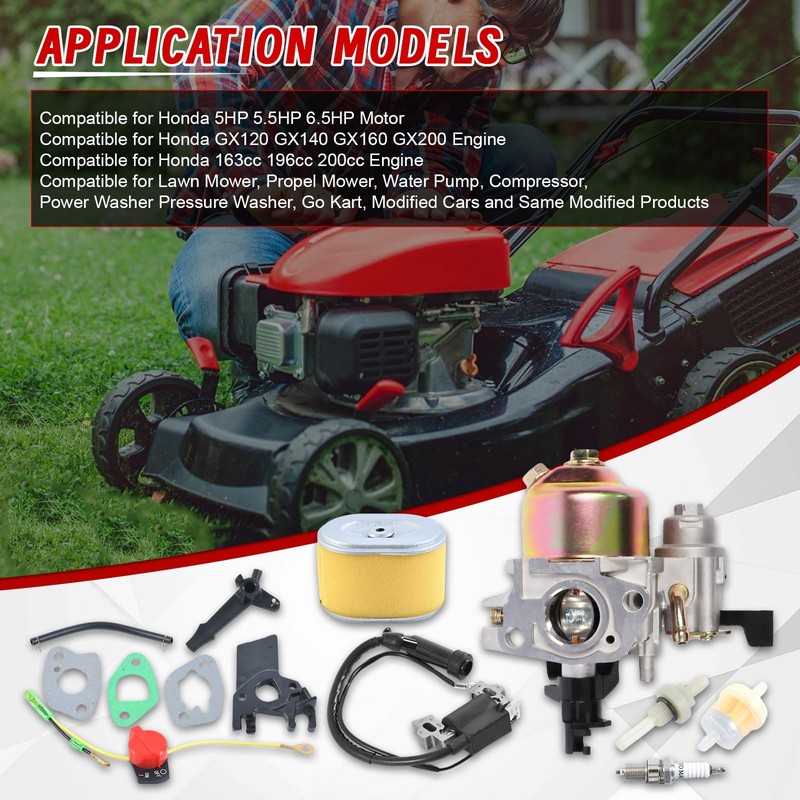 - Applicable Model: Carburetor kit is replacement for Honda 5HP 5.5HP 6.5HP Motor. Replacement for Honda GX120 GX140 GX160 GX200 Engine. Replacement for Lawn Mower, Propel Mower, Water Pump, Compressor, Power Washer Pressure Washer, Go Kart.