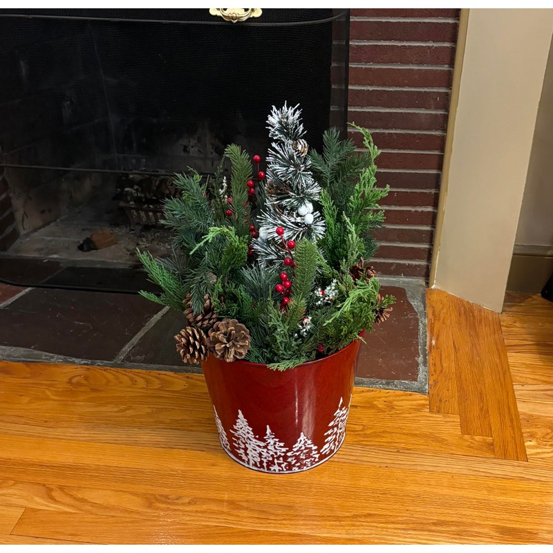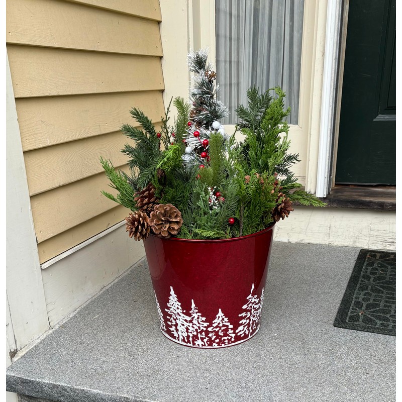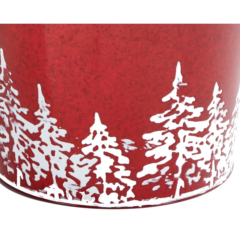 Worth Imports Red Galvanized Metal Christmas Planter Bucket with Tree Design, 10.5" Height, 12" Diameter, Set of 2