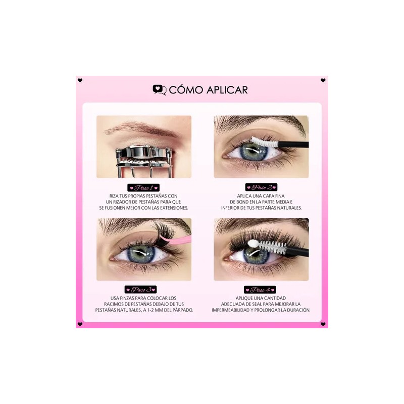 ¿Cómo aplicar las pestañas? 1.Riza tus pestañas naturales con un rizador para integrarlas mejor con las extensiones. 2.Aplica pegamento en la base de tus pestañas naturales con un aplicador fino. 3.Espera 8-10 segundos para que el pegamento se torne ligeramente viscoso (esto mejora la adherencia). 4.Toma las pestañas postizas con pinzas desde la raíz para evitar dañar las hebras. 5.Colócalas debajo de tus pestañas naturales, alineando la base con tu línea de las pestañas. 6.Presiona suavemente durante 1 minuto para fijarlas correctamente.