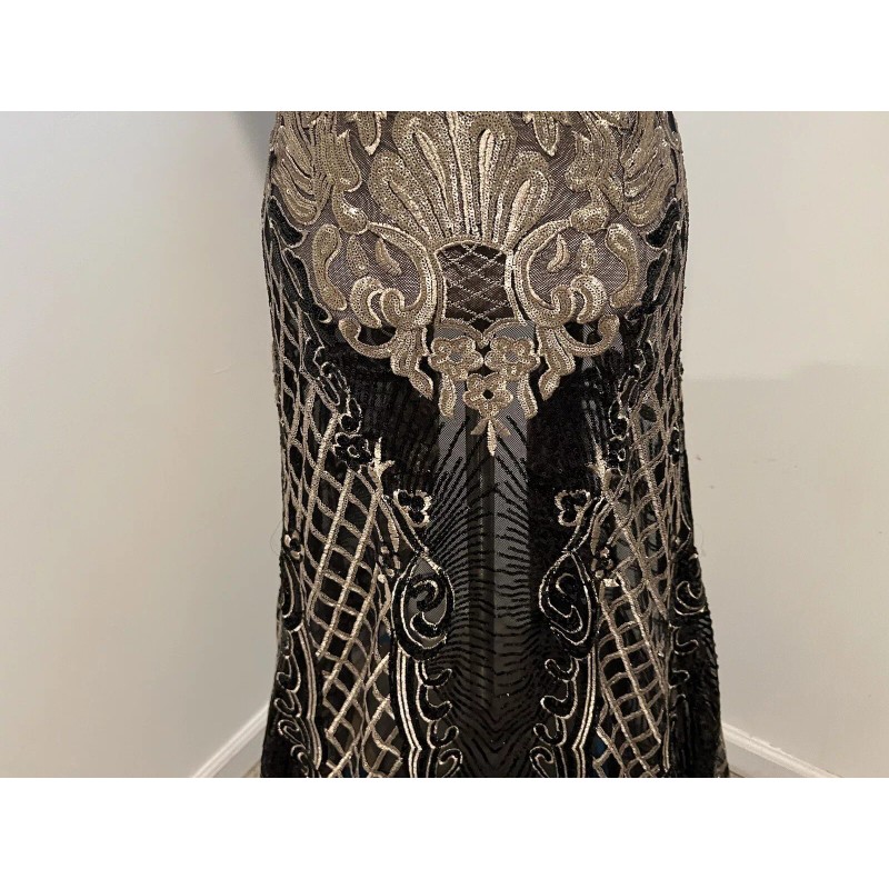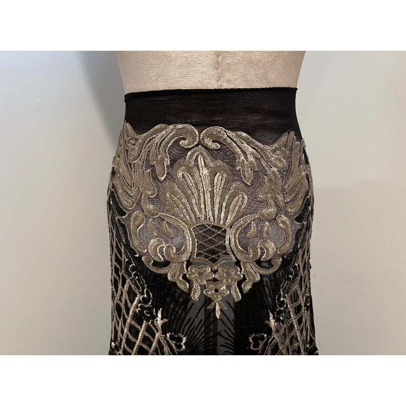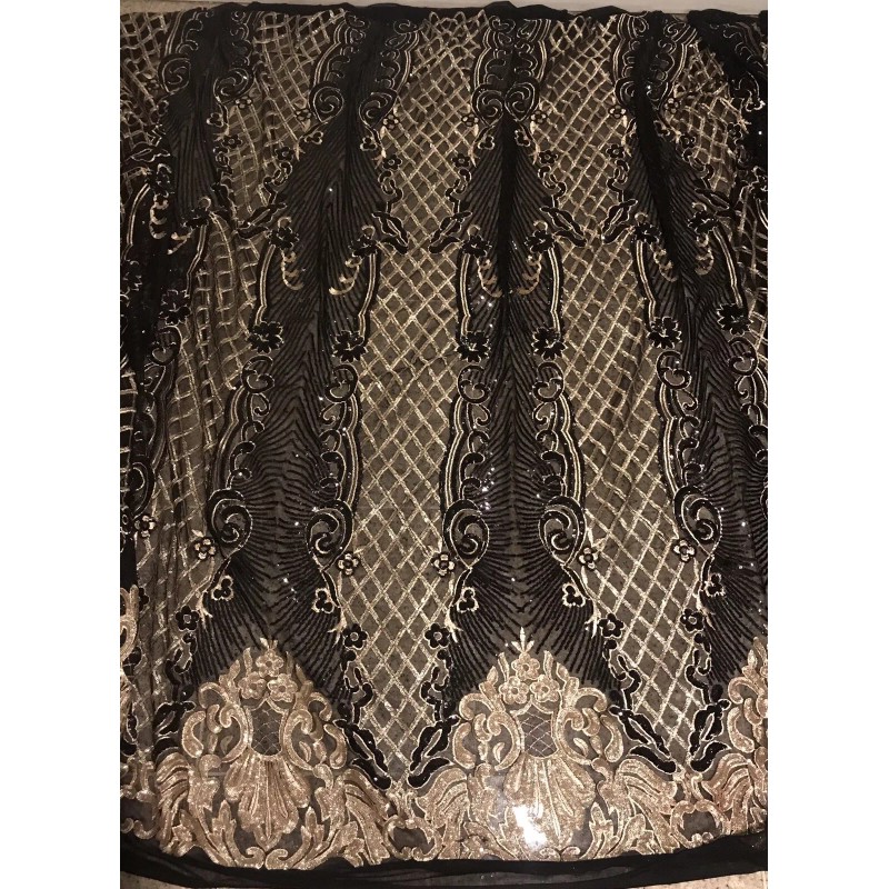 Add a touch of elegance to your next sewing project with this stunning Black Gold Embroidery Lace fabric. The fabric features beautiful floral patterns made of sequins that will give your dress, costume or bridal gown a glamorous look. It is made of synthetic fiber content and has a medium weight suitable for apparel, crafts, and special occasions.