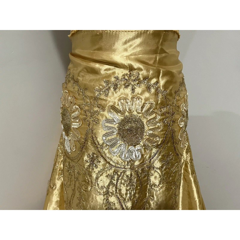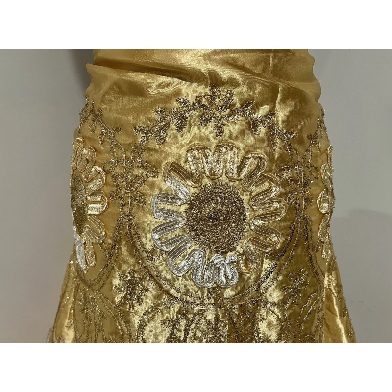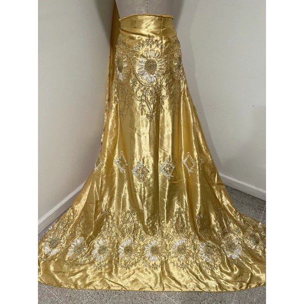 Add a touch of elegance to your apparel with this beautiful GOLD IVORY Satin W/Embroidery sequins Lace fabric. The medium weight fabric measures 50" in width and is sold by the yard. It features a floral pattern and is made of synthetic fiber content.