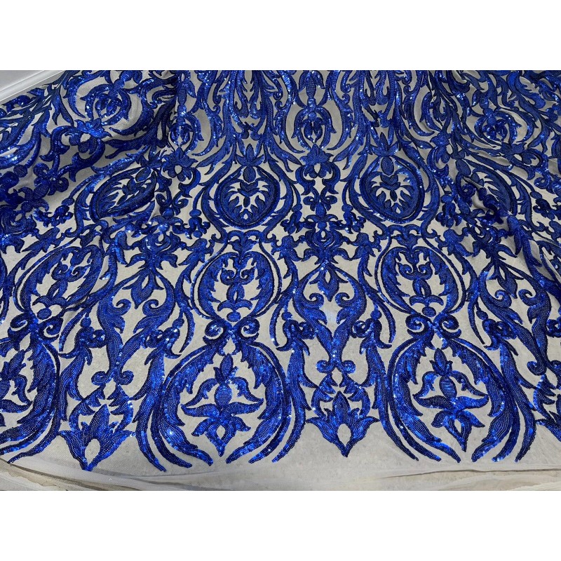 This is beautiful royal blue sequins embroidery sewn on gold 4way stretch mesh fabric . This fabric was made to be worn for all types of events, as it features a beautiful design that can make any outfit stand out. It can also be used for prom dress,dance wear, evening gowns, dresses, draping, costumes, You can style this fabric in many ways, now available at a great price!