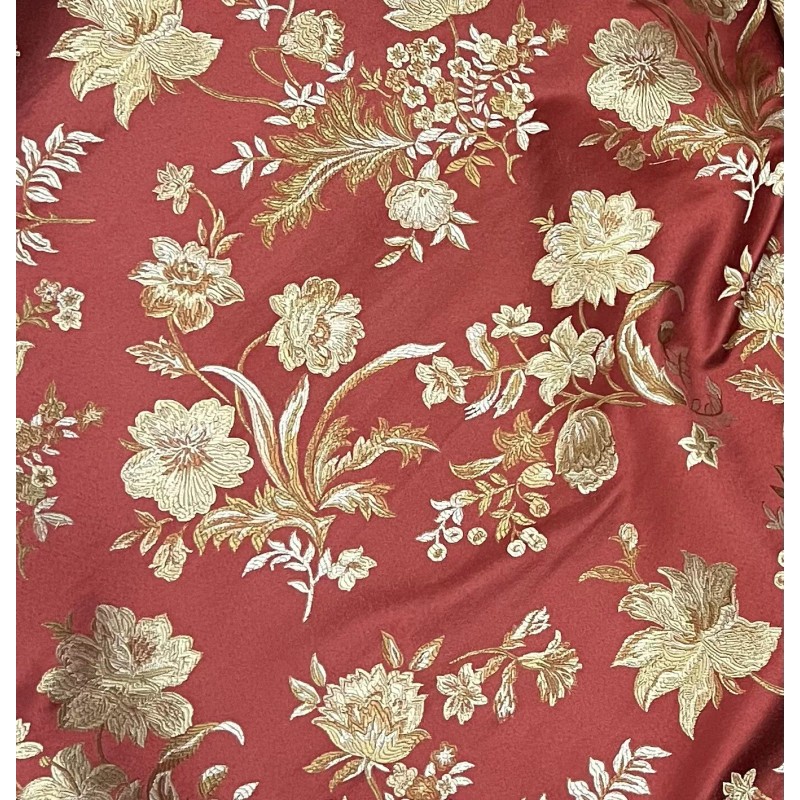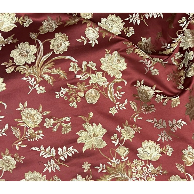 Add a touch of glamour to your creations with this ruby red gold green upholstery brocade jacquard fabric. Measuring 54" in width and sold by the yard, this medium-weight fabric features a stunning floral pattern that is perfect for a variety of projects including apparel, home décor, and crafts. The material is made of synthetic fiber content that is suitable for draping, upholstery, and curtains.