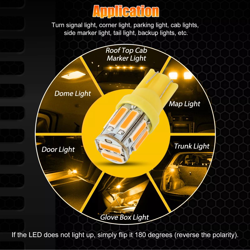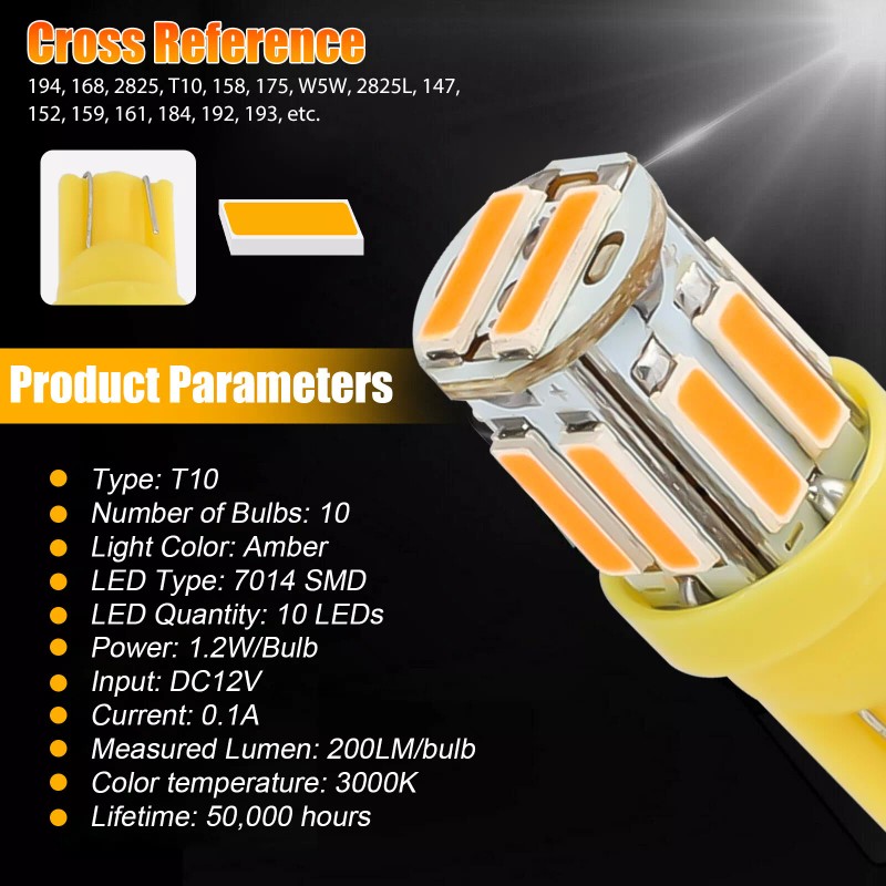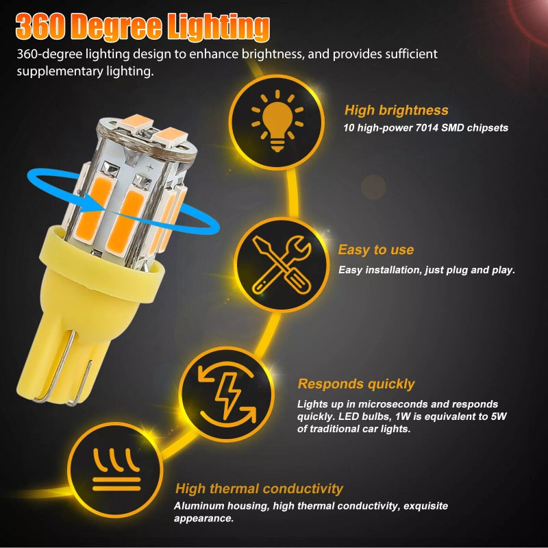 - ✅ High Brightest Amber: (Set of 10 bulbs) Each 194 LED bulb owns 10-pcs high power 7014 SMD Chipsets, uniform beam pattern, 360-degree lighting design to enhance brightness, and provides sufficient supplementary lighting.