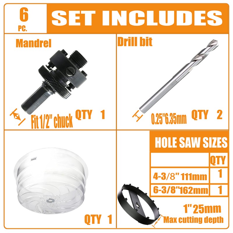- Advantage 1: The specially kit includes 4-3/8”, 6-3/8” carbide grit hole saw with extra dust bowl. It’s more helpful for drilling the ceiling tile and installing recessed light. It’s more clean.