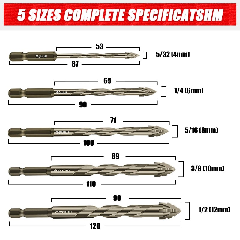 【Industrial-Strength Cross-Head Tip】Each drill bit features a cross-head tip that enhances cutting power and precision. This professional-grade design ensures that the bit cuts through materials effortlessly, providing cleaner and more accurate holes. When working with harder surfaces such as glass or ceramic, it's recommended to cool the drill with water and control the speed for best performance and longevity of the bit.