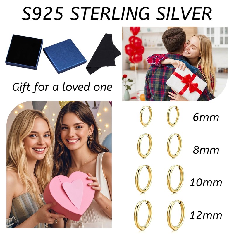 - Versatile earring set: hoop earrings 925 silver. Includes 4 pairs of 6/8/10/12 mm earrings in different sizes. These gold and silver women's earrings are perfect for a variety of piercings and can be used as hoop earrings, cartilage earrings, trago earrings, second hole earrings, triple earring sets, stacking earrings and more.